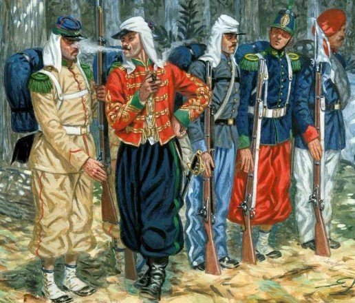 Fotografía que muestra a la Legión Voluntarios en 1868 con uniforme de verano blanco y el kepí con funda igual, titulada "El mangrullo de José Giribone" (Cuarterolo, Miguel Ángel "Soldados de la memoria", Ed. Planeta, Bs. As. 2000).